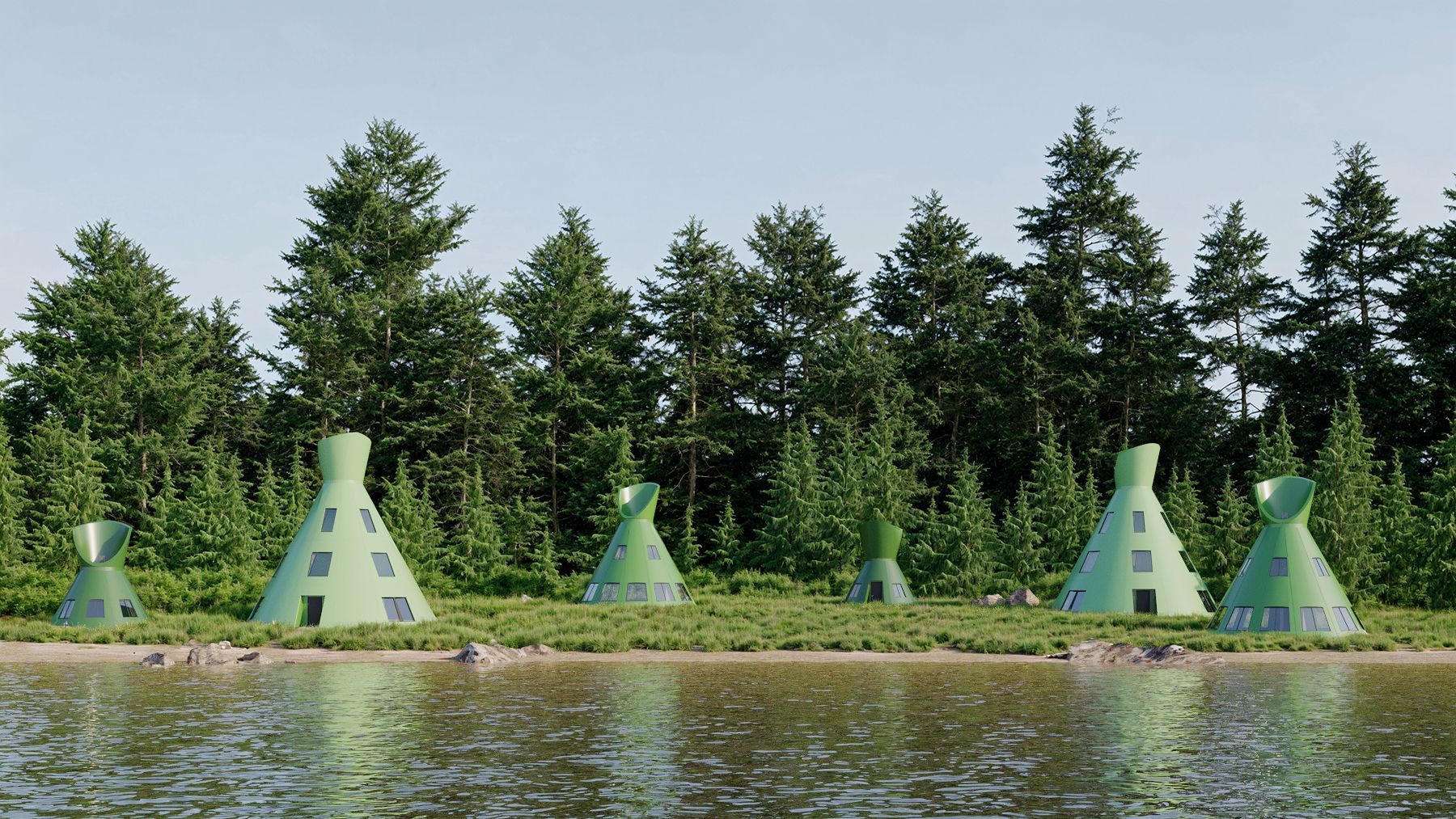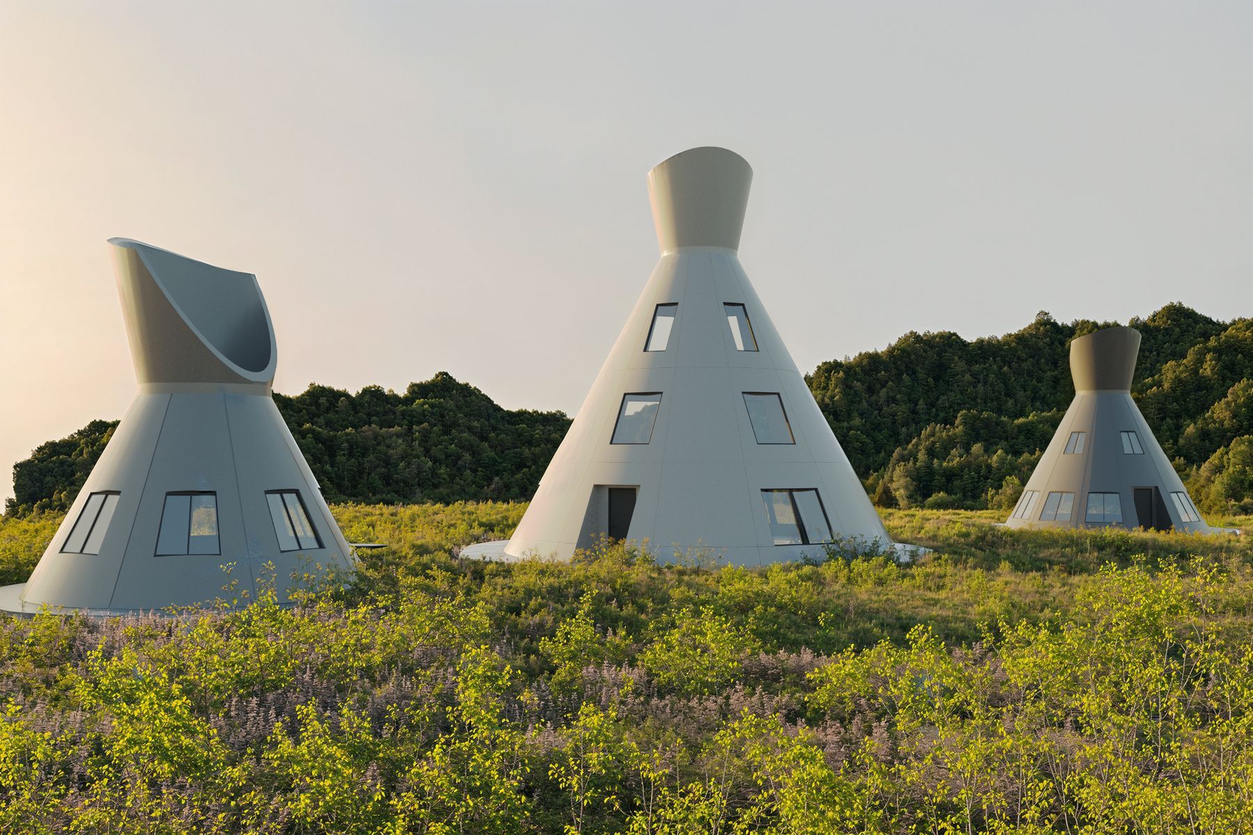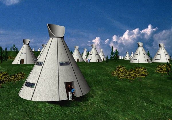 Principal Architect Randal Jay Ehm developed a prototypical community on the Pine Ridge Indian Reservation for a private client in 2002. For the project, he designed a new hurricane-proof, lightweight tipi that will be fabricated as modular units and erected by three workers. These structures are more aerodynamic than the wind-tested domes that resist 120-mph winds in the Arctic. They are mold-resistant and relocatable. A self-contained generator unit provides auxiliary power where located off of a power grid, while solar energy provides the main source of electricity. The tipis can be connected to domestic sewer or septic systems and typically utilize greywater systems. The design is based on traditional Lakota tipi styles where a central fire pit exhausts through the “arms” above. The structures are being marketed globally and can be used for residential, commercial and educational facilities.