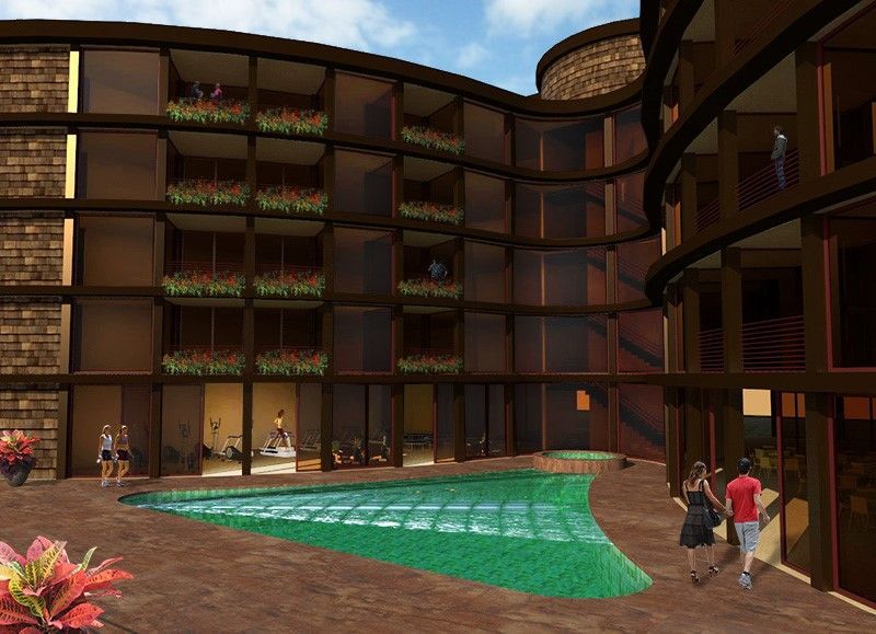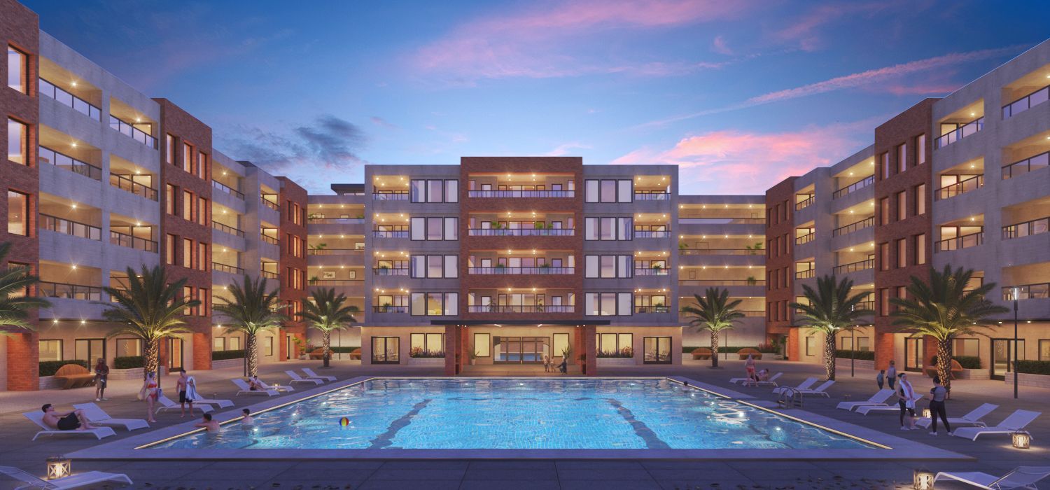 The central courtyard and pool area is surrounded by small sports-themed bars and specialty shops. First-floor tenants along the street were to be selected based on their relevance to the year-round sports activity and temperate climate of Surprise.