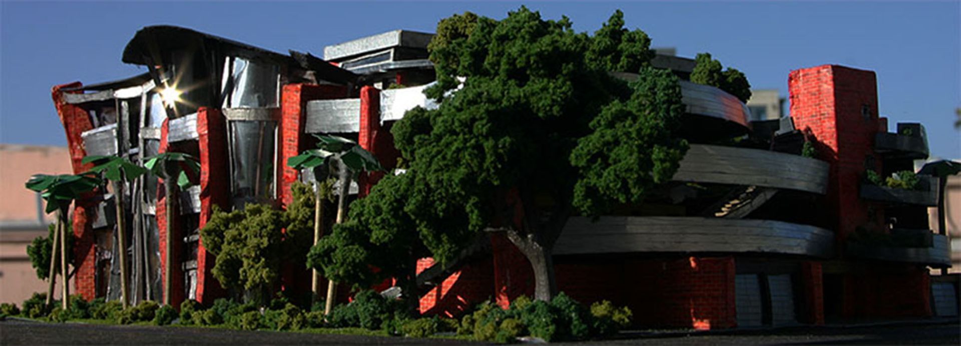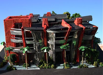 The design concept is an abstraction of dilapidated old brick movie studios, with the striped stainless steel deck railings designed to represent film cans. Both pay homage to the strong local film and television industry. The project features multiple levels of green roof, allowing food production onsite and responding strongly to the environment.