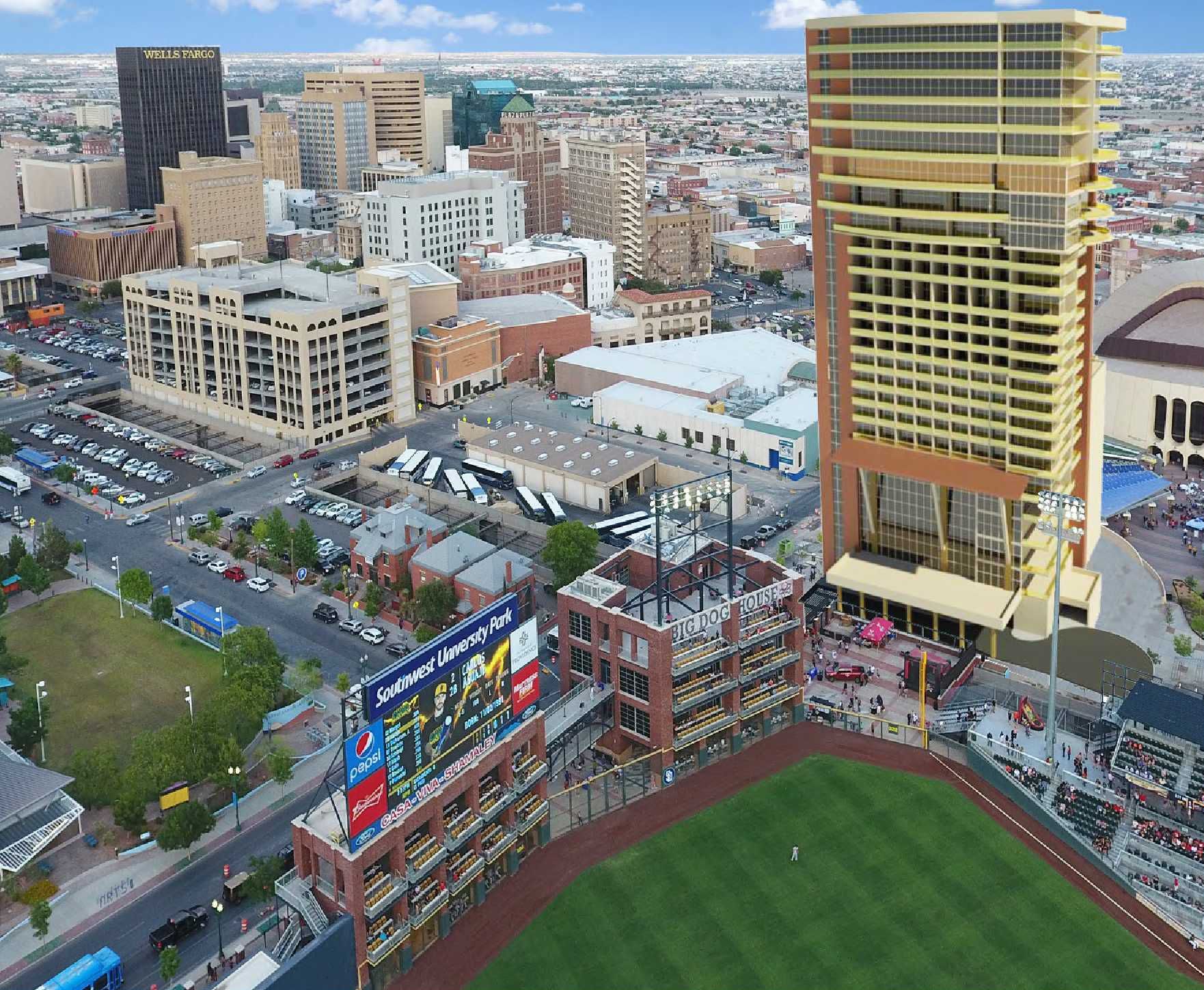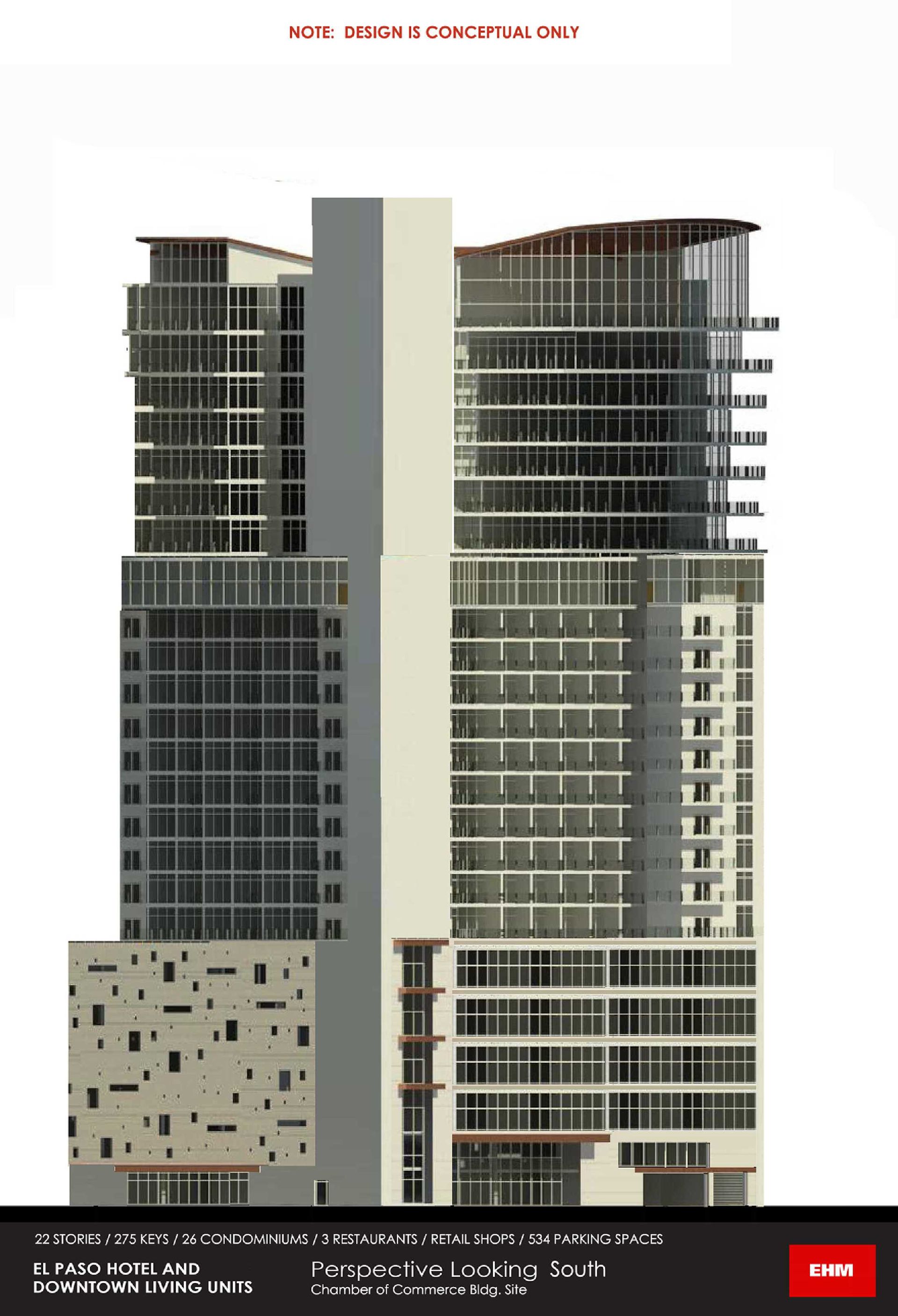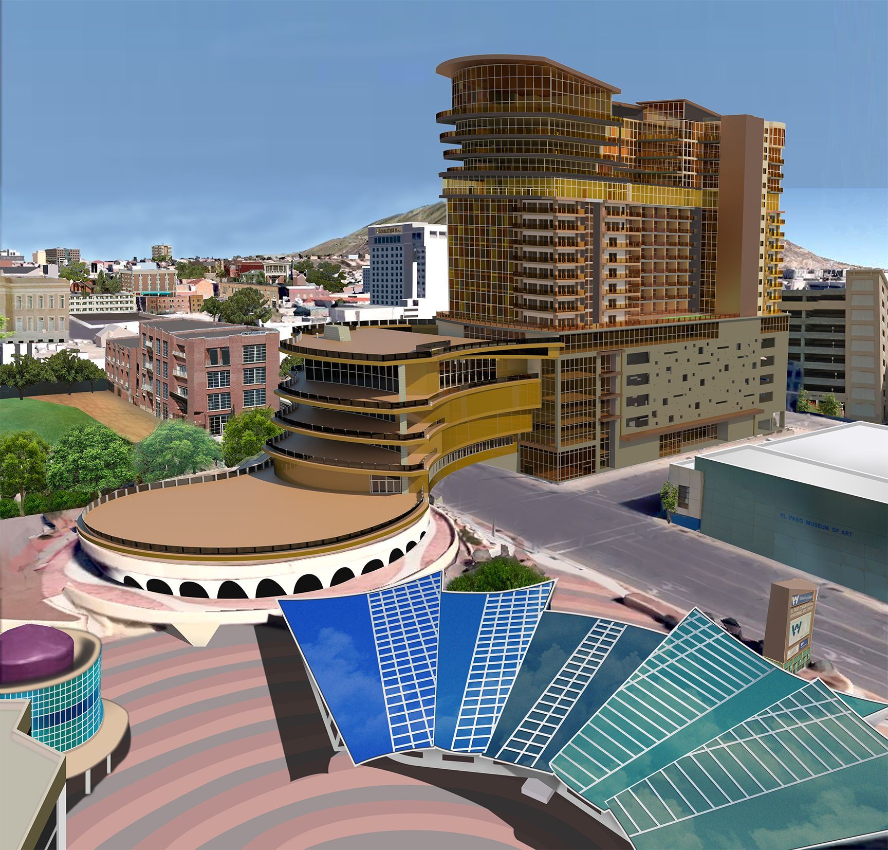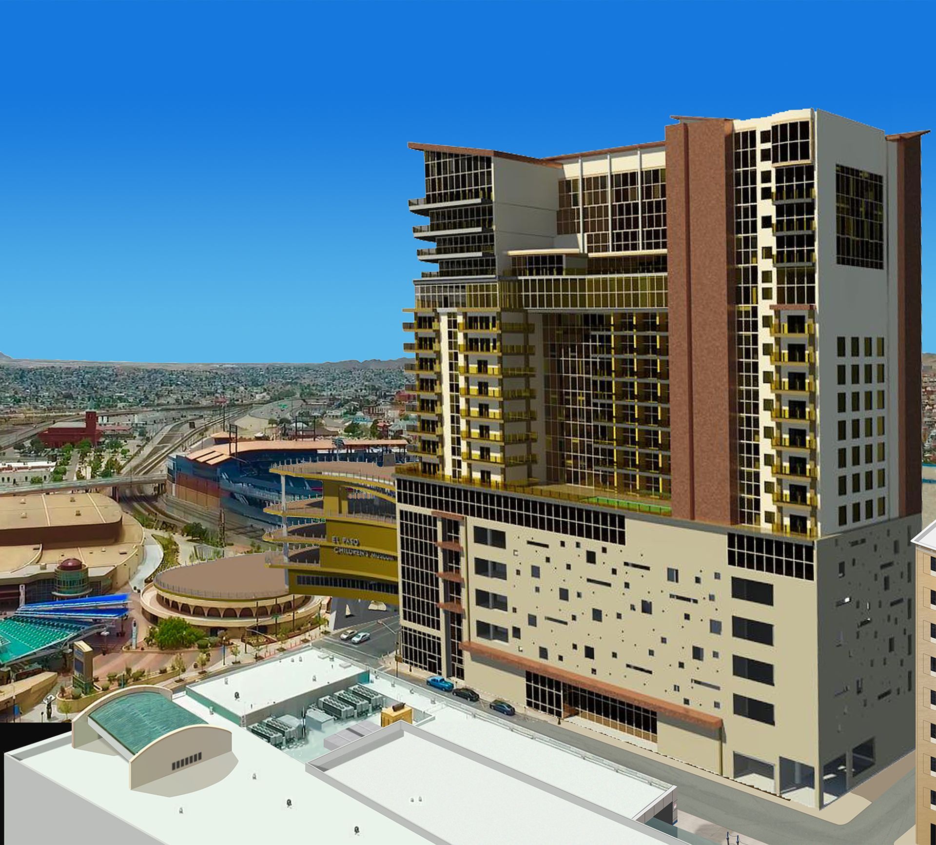 Principal Architect Randal Ehm’s development company, Ehmpire LLC, is proposing to develop this 275-room hotel through a Public-Private Partnership with City of El Paso. The project will provide the City with a state-of-the-art hotel to serve its conventioneers, and will provide a conference center linkage spanning over Santa Fe Street to the existing Convention Center. As the site we prefer to develop on is City-Owned but already earmarked for construction for a Childrens’ Museum, we are proposing to build the museum over the Santa Fe Street linkage and to give it its own aesthetic identity, separate from the hotel. Project amenities include a large public deck adjacent to the San Diego Padres farm-team’s ballpark, a 10th-floor restaurant and bar with outdoor patio overlooking the ballpark, and 25 upscale condominiums with clubhouse and pool.