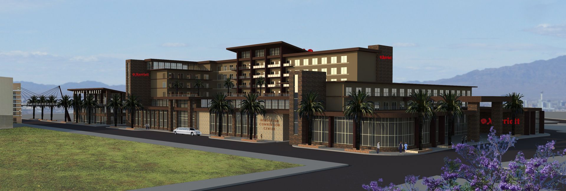 In response to City of Henderson’s Request for Proposals, Principal Architect Randal Ehm assembled a stellar Development Team to pursue development of this new $90 million Convention Center and Hotel. Within two weeks, Mr. Ehm orchestrated a phenomenal effort to secure the participation of a major investment group, a management company to handle both facilities, a construction management company to build them, a Henderson architect who gave us a local presence, an incentives expert and a group of talented and greatly experienced design and engineering consultants, Due to late confirmation that the investment group would participate, Randal designed the project and his staff produced the renderings below in just five days.