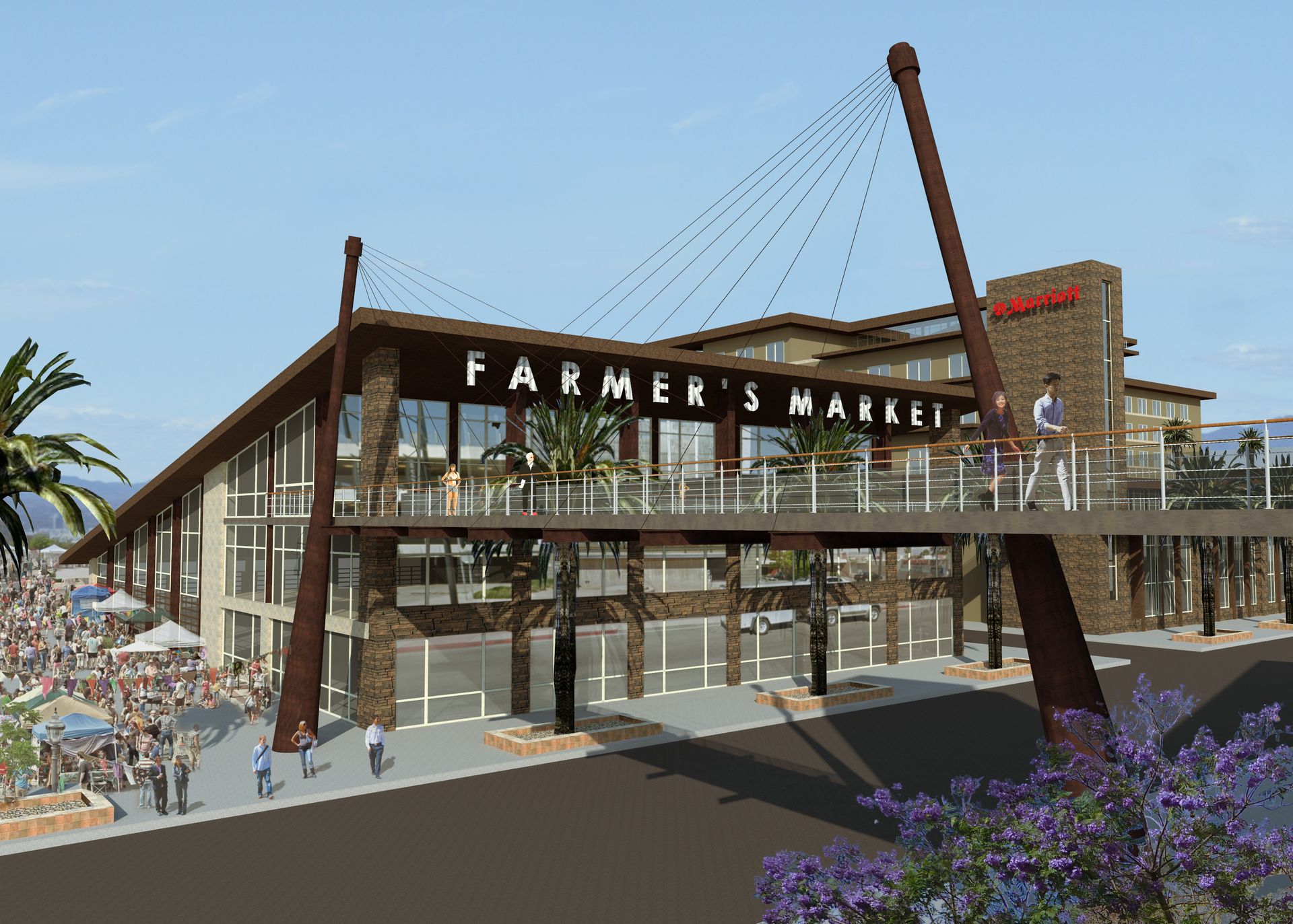 The project features a 60,000 gross square foot convention Center, a 183-room full-service hotel, a 150-seat restaurant and lounge, retail spaces and a large indoor-outdoor pool pavilion. A showpiece of the project is a new 12,000 square foot, three-story Farmer’s Market with a new suspension bridge for pedestrians.