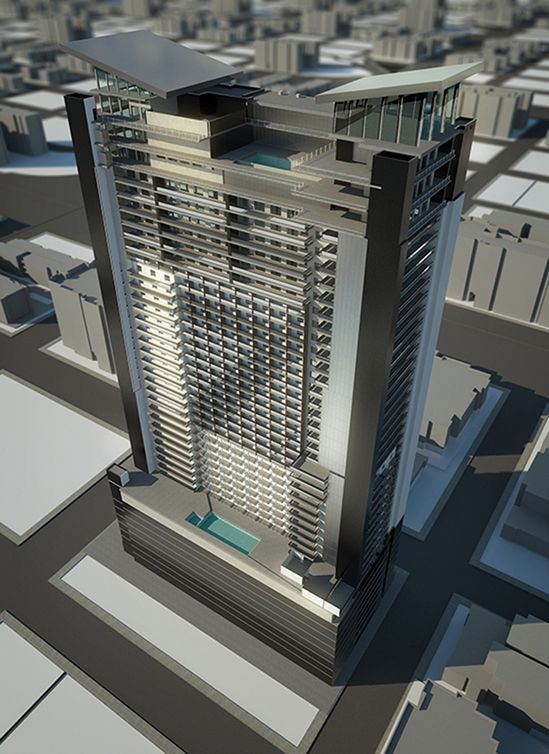 For Ehmpire LLC, we designed this 28-story building to accommodate a 275-room upscale hotel, and 26 luxury condominiums. Project amenities include a large public deck overlooking the San Diego Padres farm-team’s ballpark, a 19th-floor restaurant and bar with outdoor patio overlooking the ballpark, and 50,000 square feet of conference space.